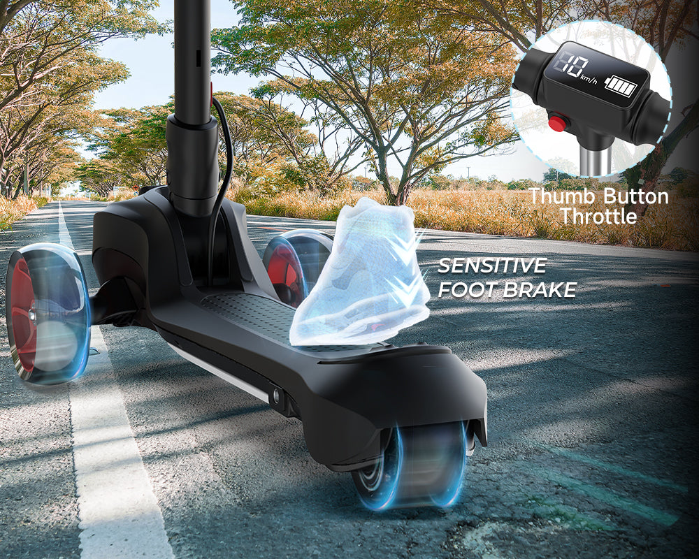 Designed with a sensitive foot brake and a convenient thumb button throttle, this scooter offers precise and responsive handling for a safe and enjoyable ride. The 100W powerful motor ensures a smooth and efficient ride, perfect for both beginners and more experienced riders.