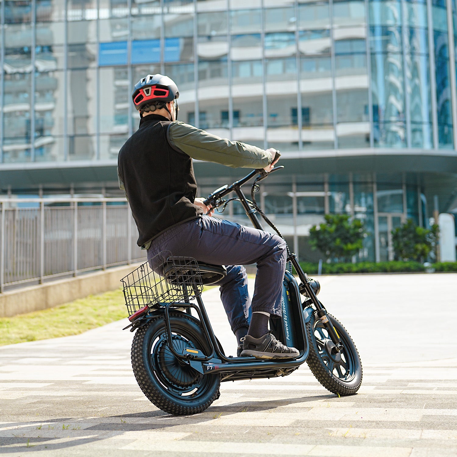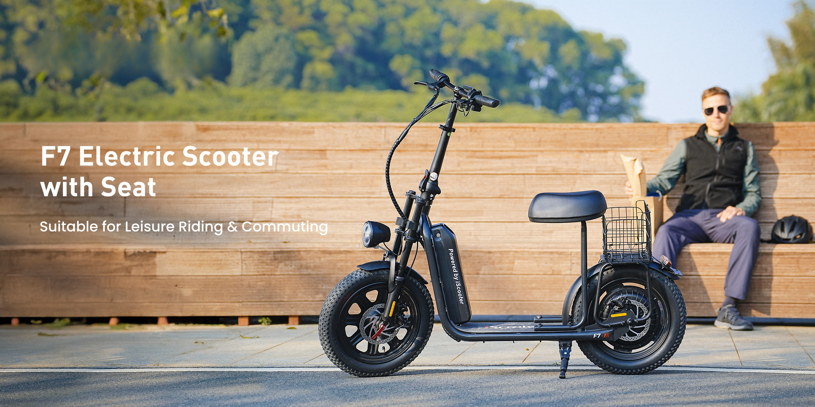 The seated F7 Electric Scooter revolutionizes urban mobility. With a 1000W motor, it provides great power, enabling easy navigation through city streets, slopes, and traffic.