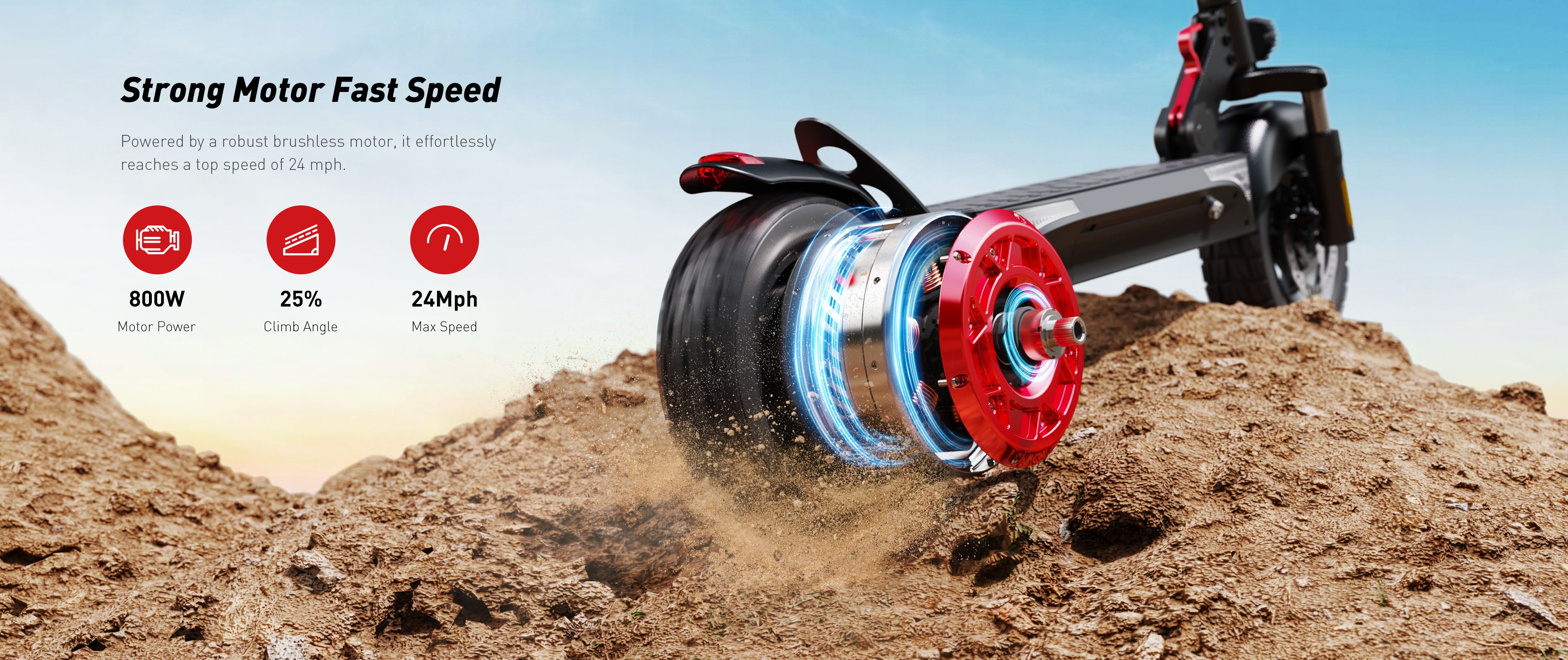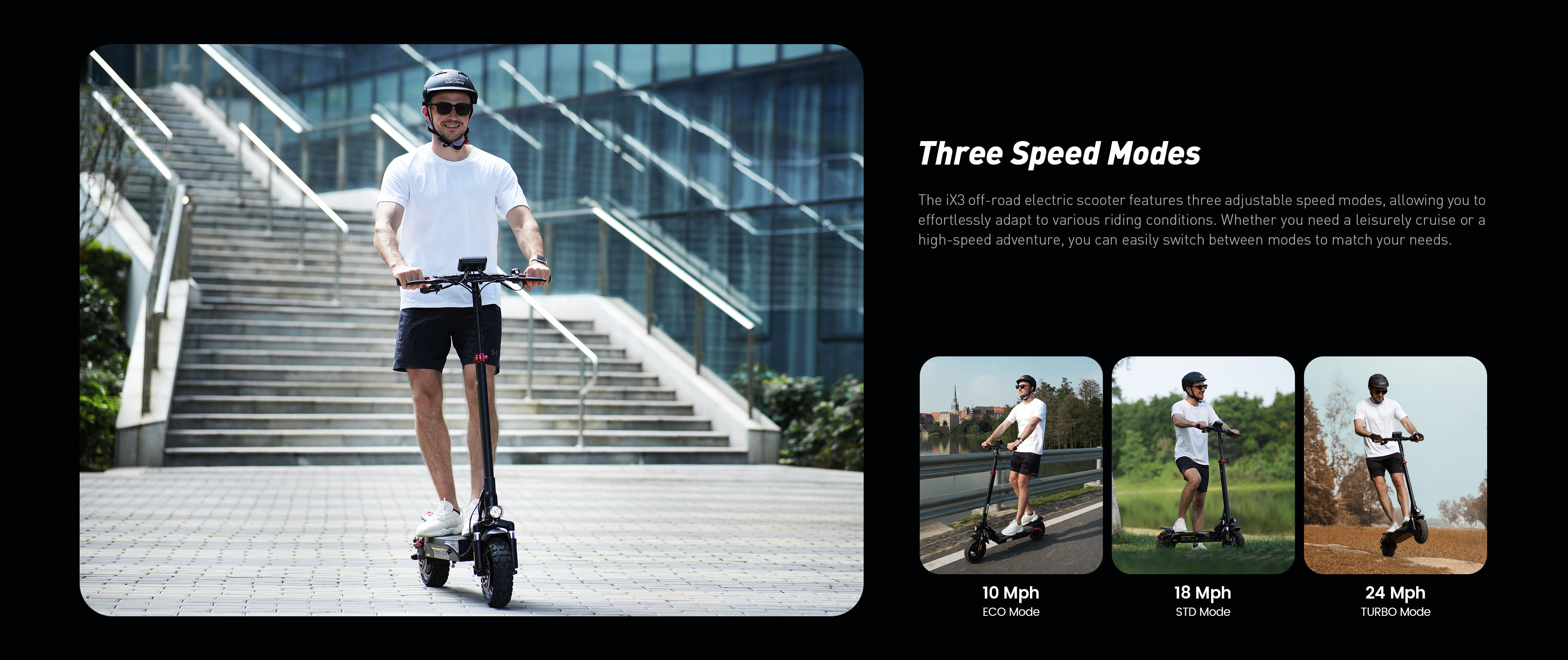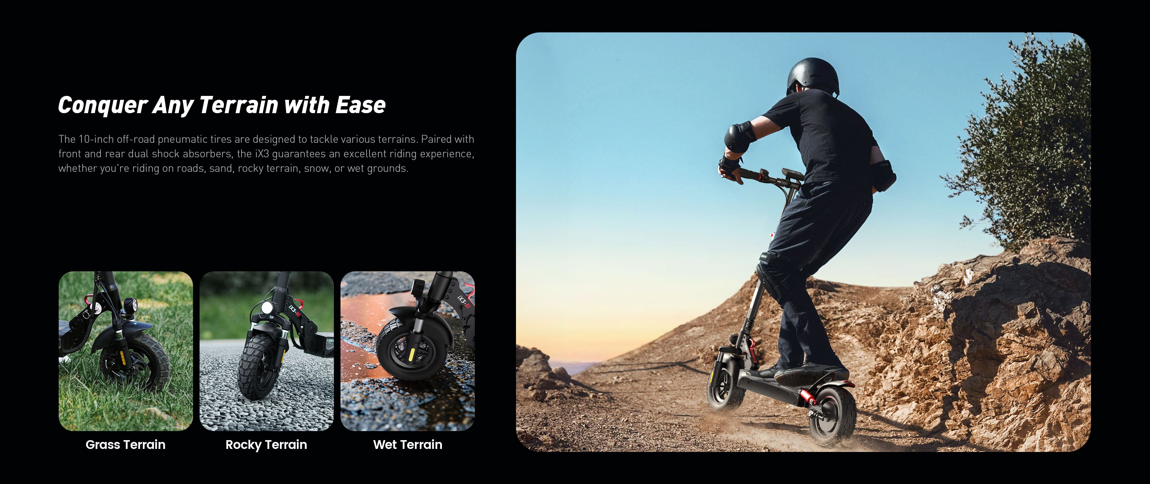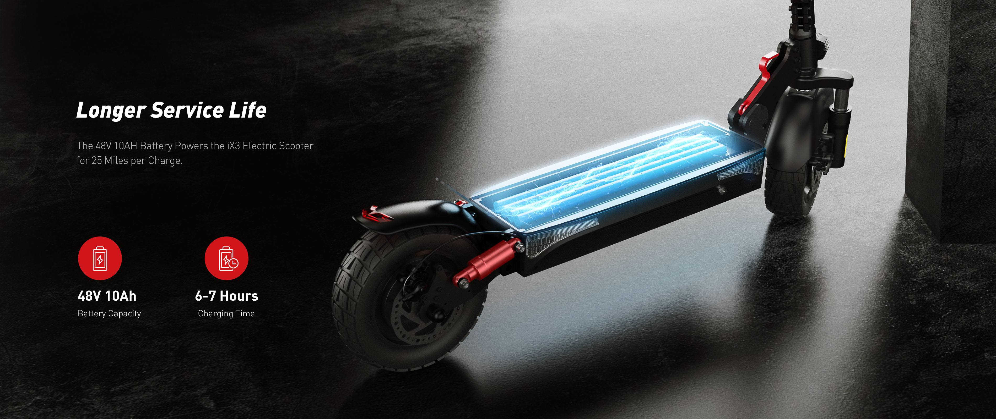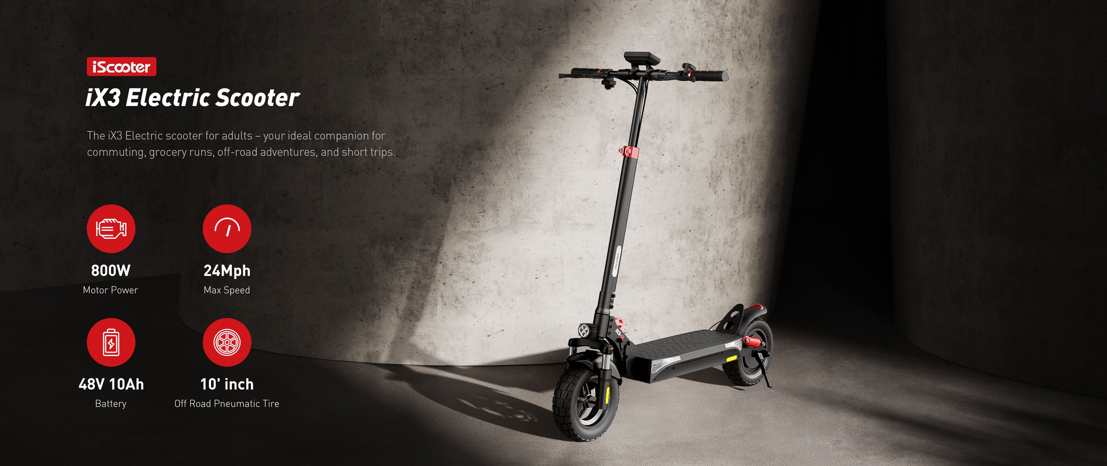 Enhance your outdoor experience with the iX3 electric scooter. Its 800W motor ensures a fast and smooth ride. The perfect 10-inch tires can effectively absorb the impact of bumps on the road. This electric scooter is equipped with a 48V 10Ah large-capacity battery to increase the fun of your outdoor off-road.