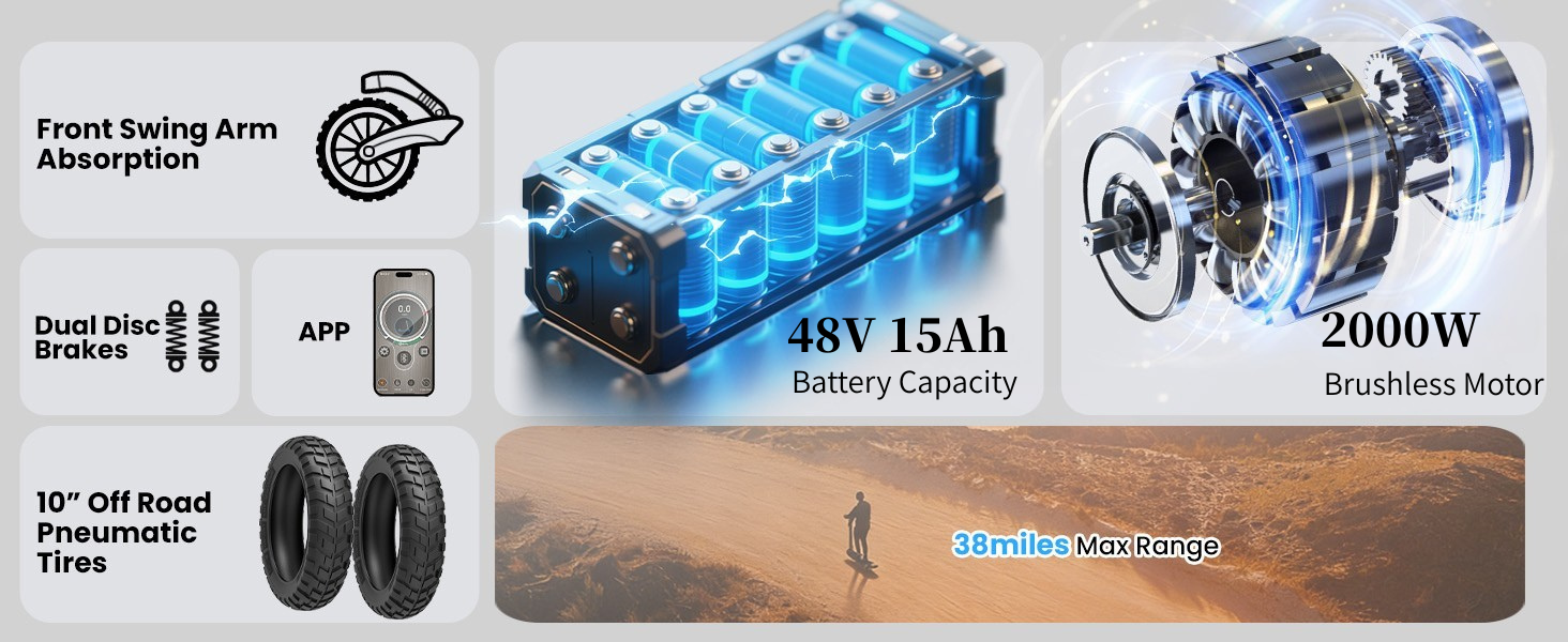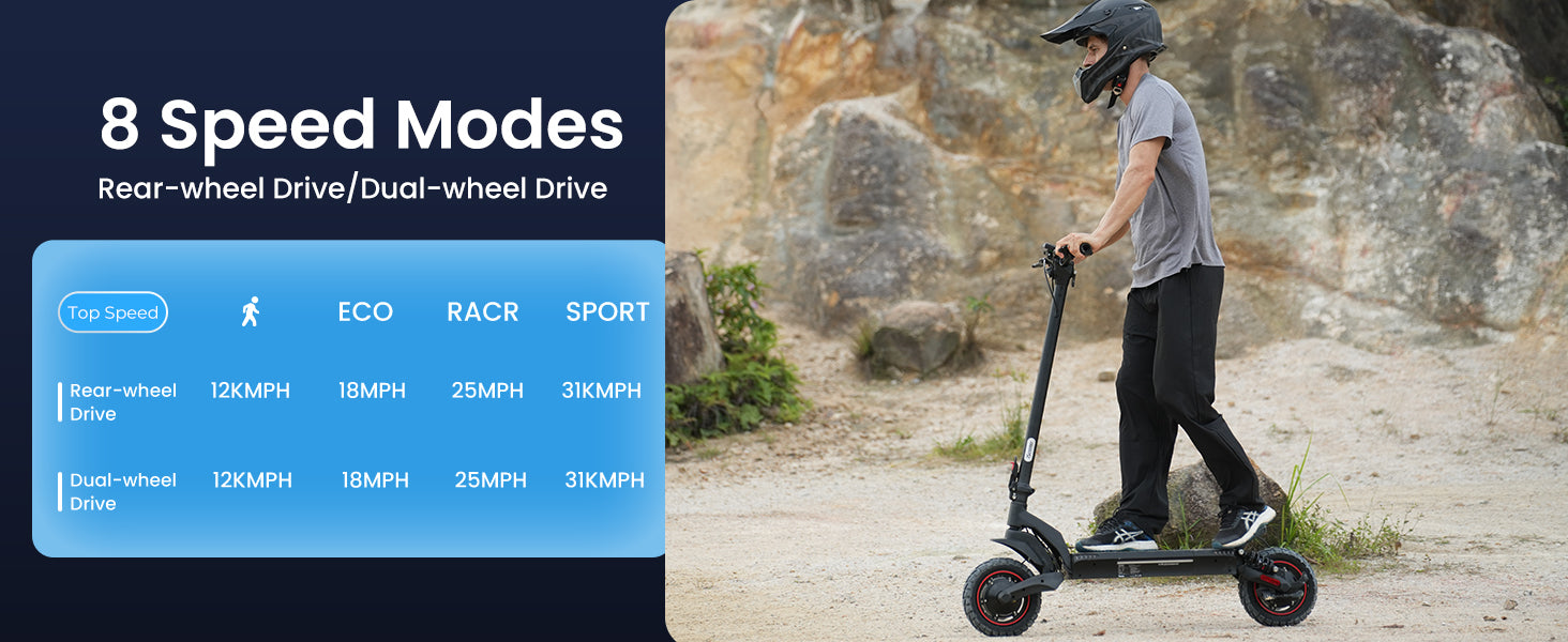 | Riding modes | (Rear-wheel drive: 12/18/25/31 MPH Dual-wheel drive: 9/18/28/38 MPH) |