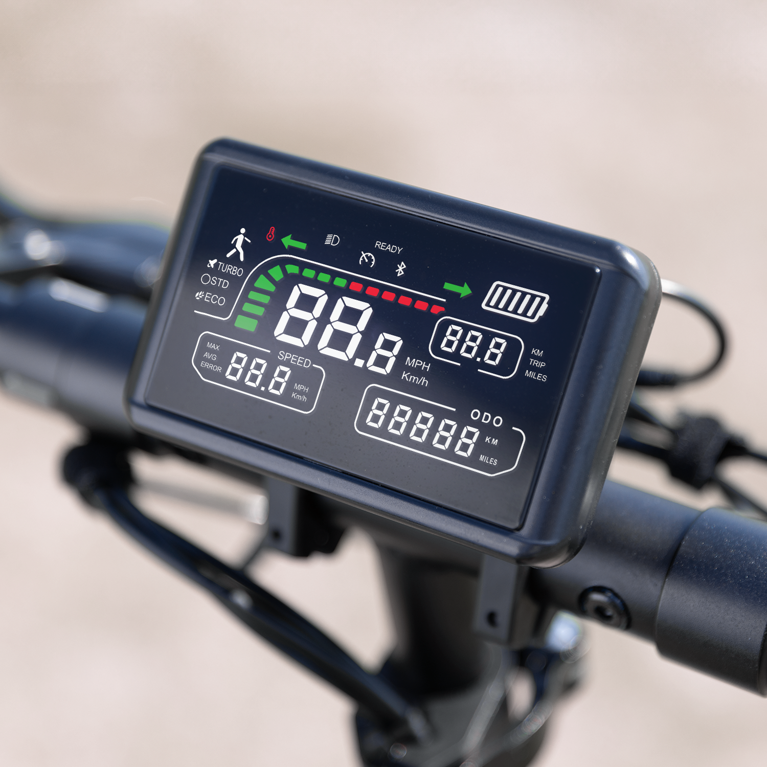 The LCD screen can display riding mode, lights, cruise control, speed, mileage, battery level and other information, and has app control.